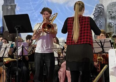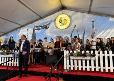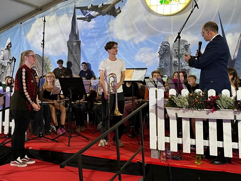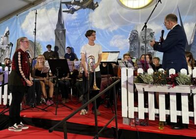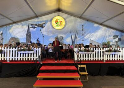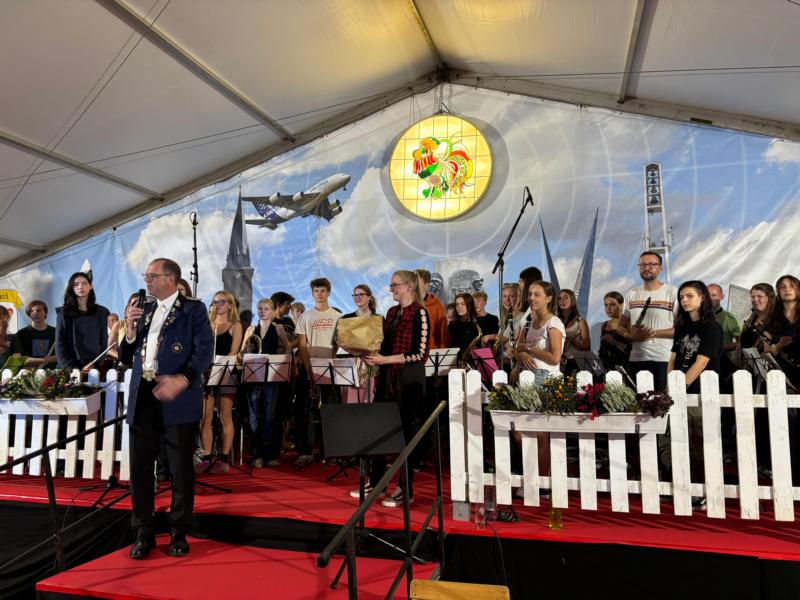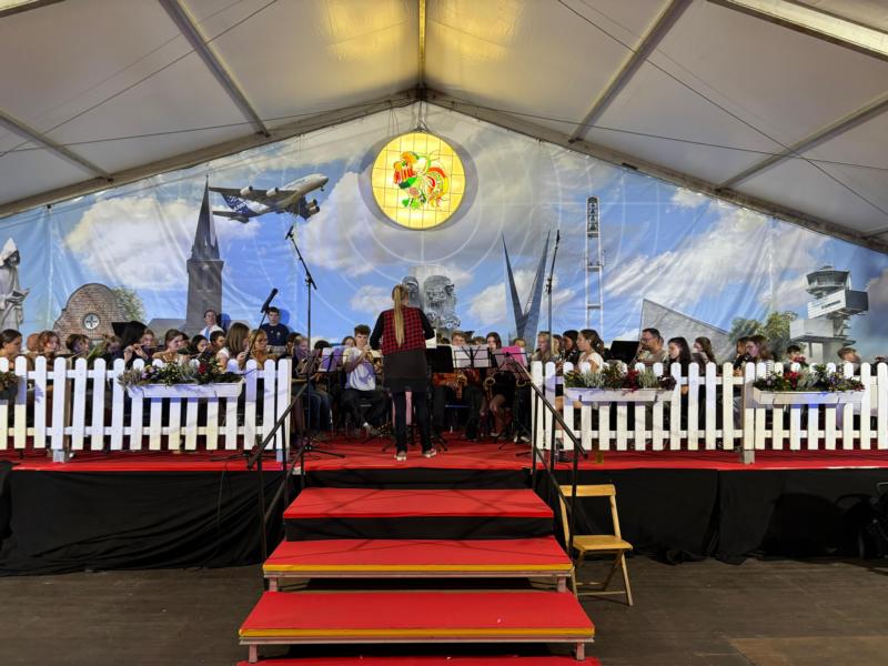 Am Freitag, den 19.09.2025, durften die Scholl-Phoniker wieder ihr Können beim Schützenfest Unterrath unter Beweis stellen. Diesmal auf der großen Bühne des Festzelts und sogar mit Mikrofonierung und richtigem Soundcheck spielten die Schüler und Schülerinnen ein 30-minütiges Programm, das es in sich hatte. Klassiker wie Atemlos (Helene Fischer) und Tage wie diese (Die Toten Hosen) durften natürlich nicht fehlen, aber auch Latin Gold (Paul Lavender) in Miserlou (Fred Wise) vom letzten Sommerkonzert waren im Programm.